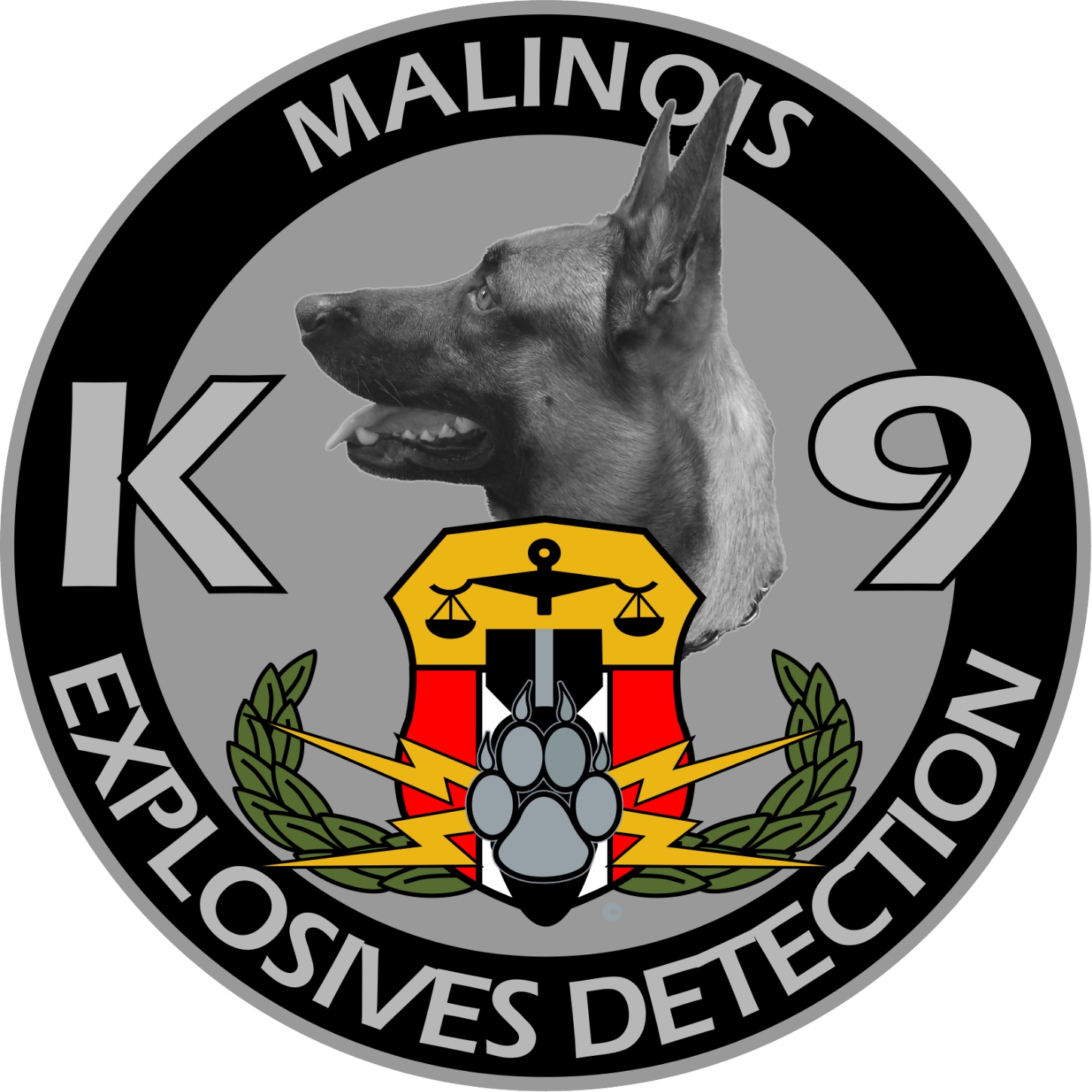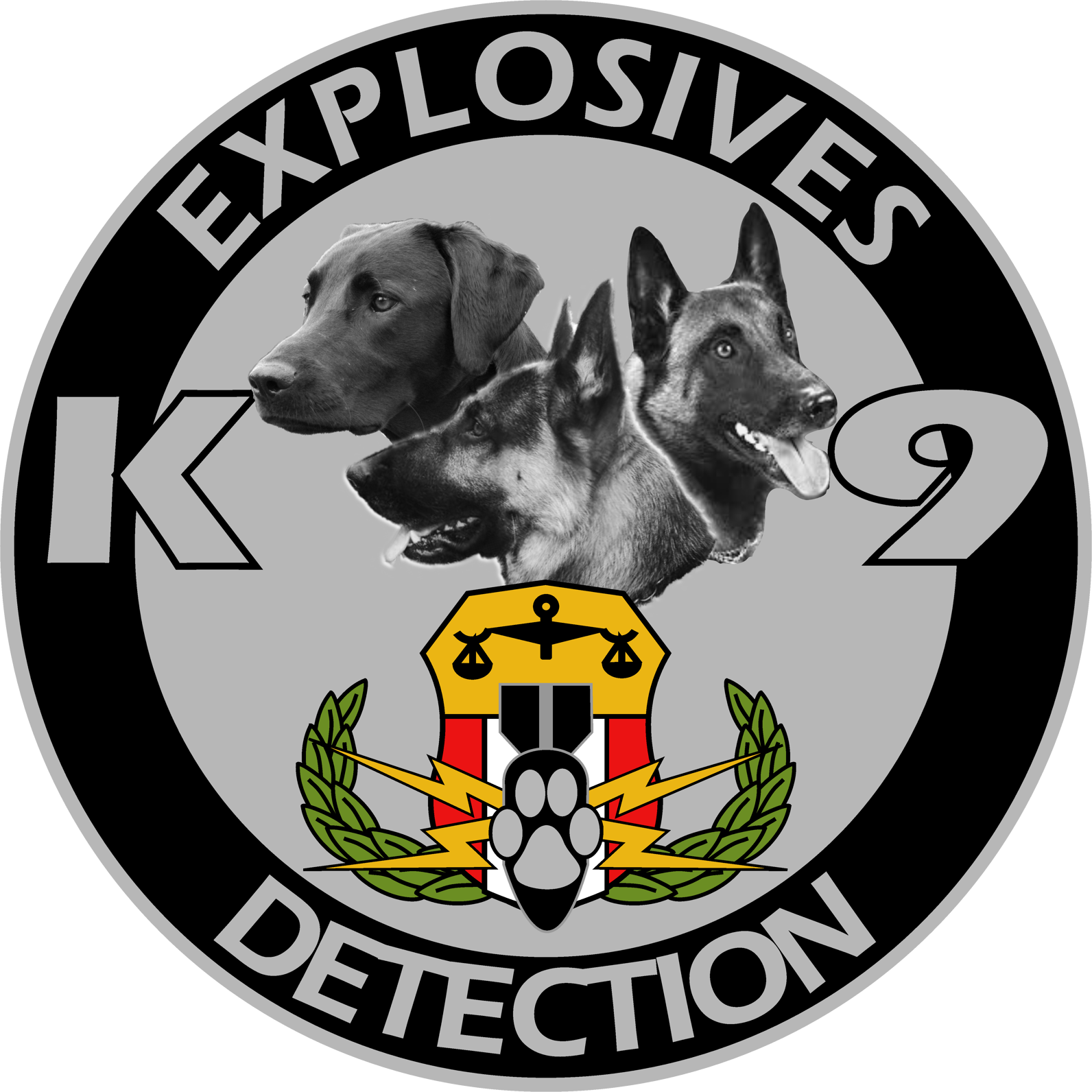 Explosives Detection K-9 on a large 4" or small 3" round high quality reflective vinyl decal. 4 options: GSD, Lab, Mal, or all 3 Dogs.