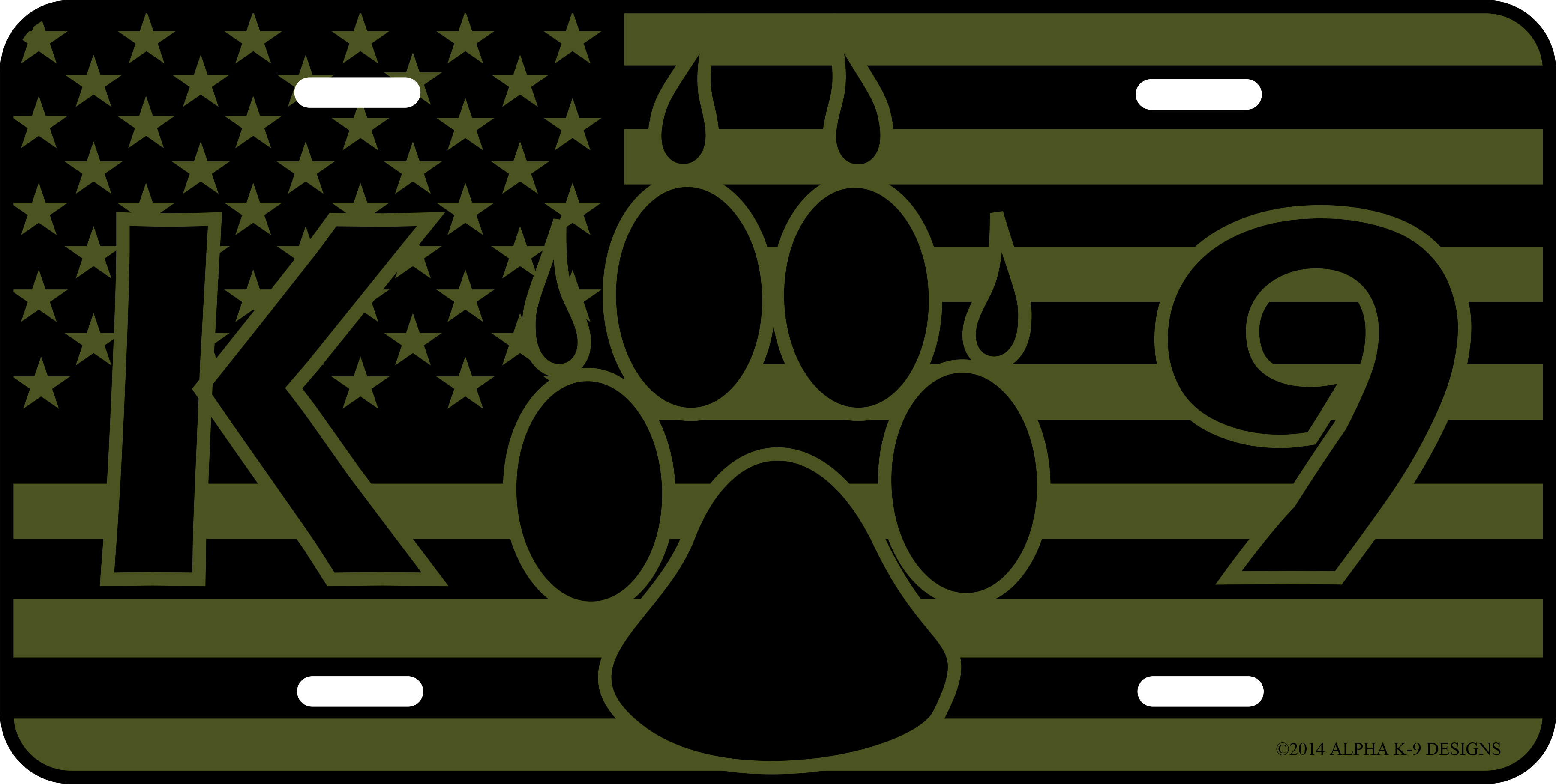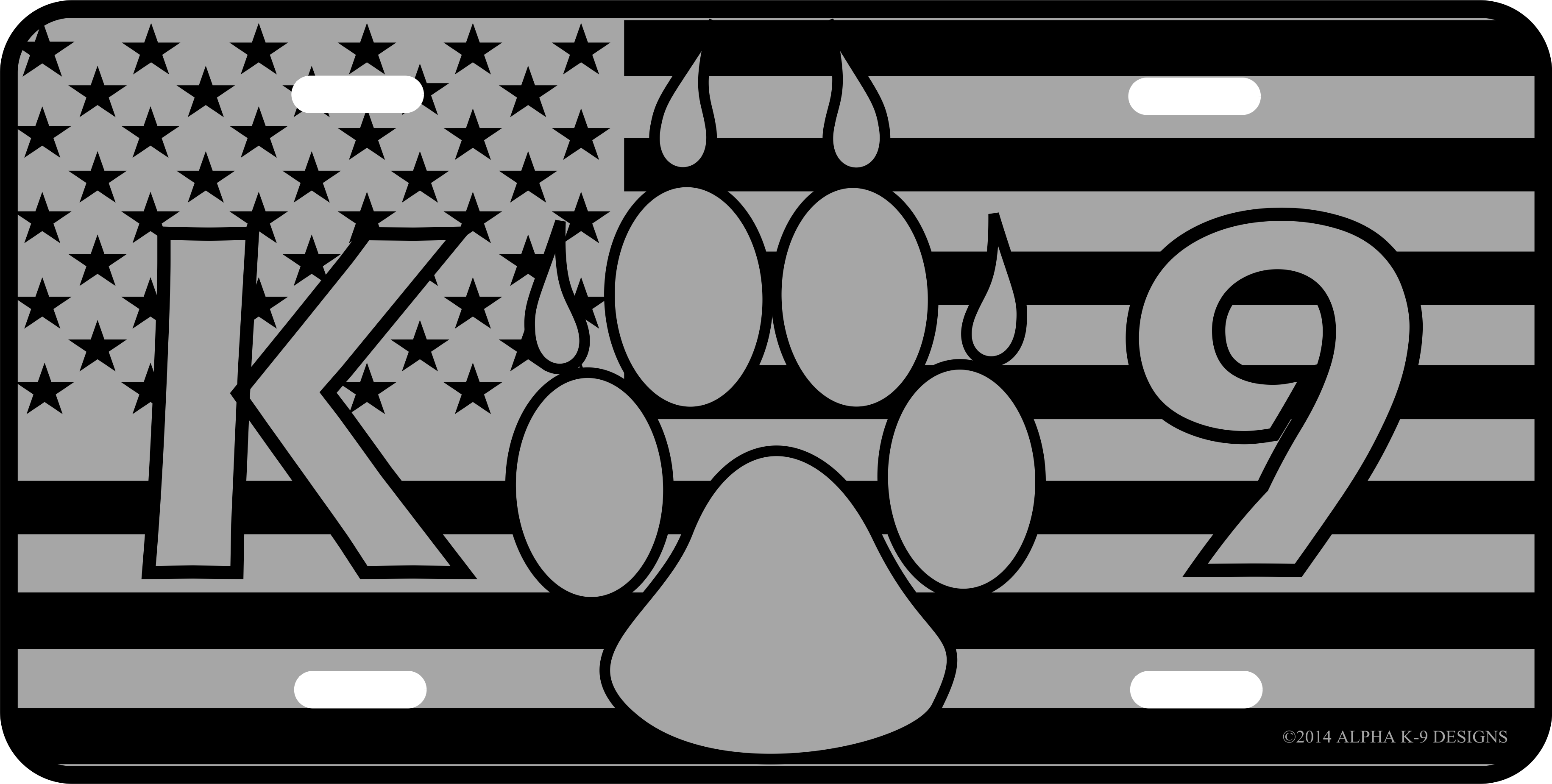 American K9 Flag design on a 6" x 12" die-sublimated aluminum license plate.