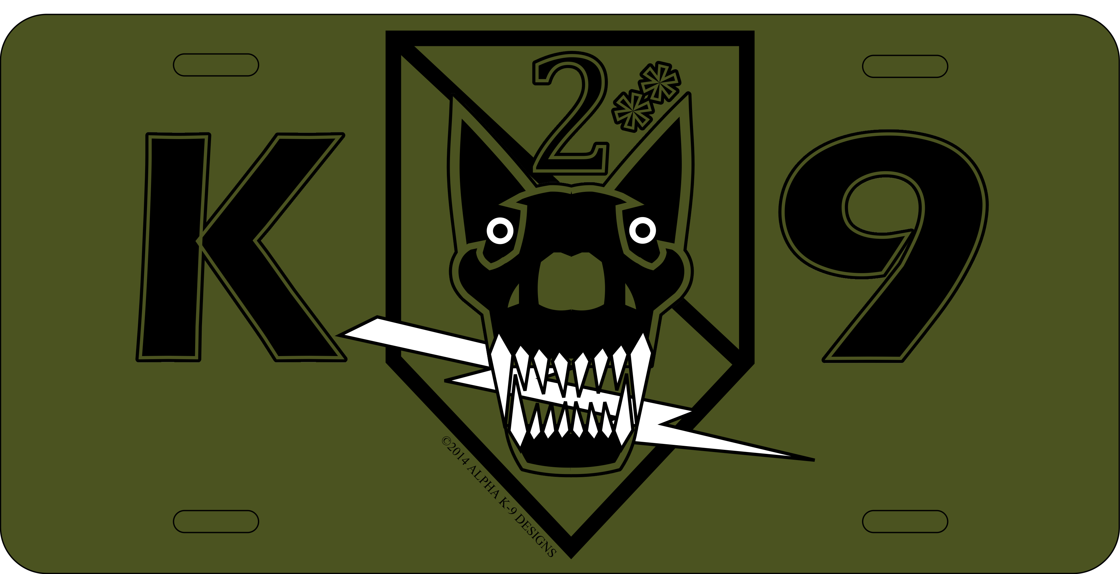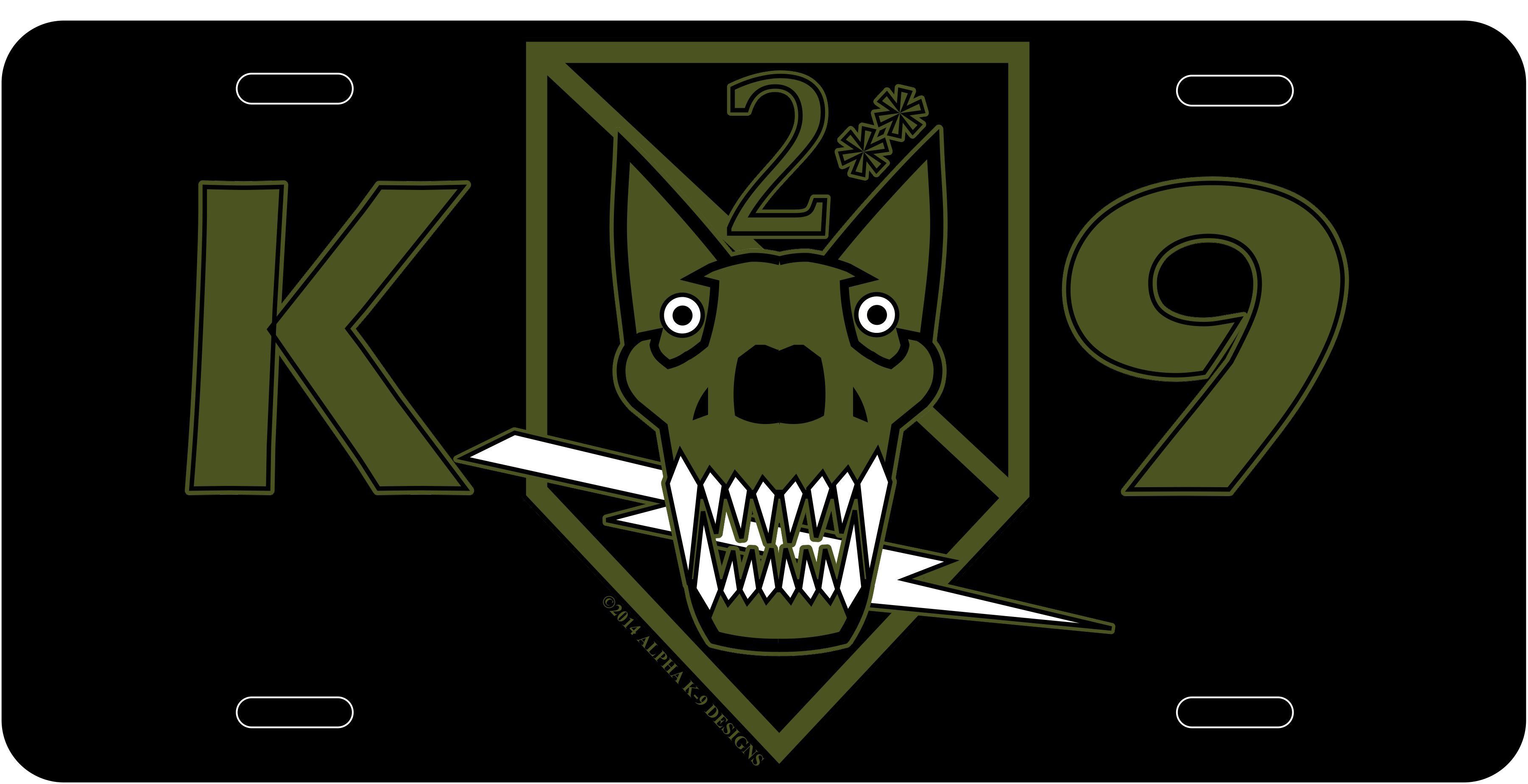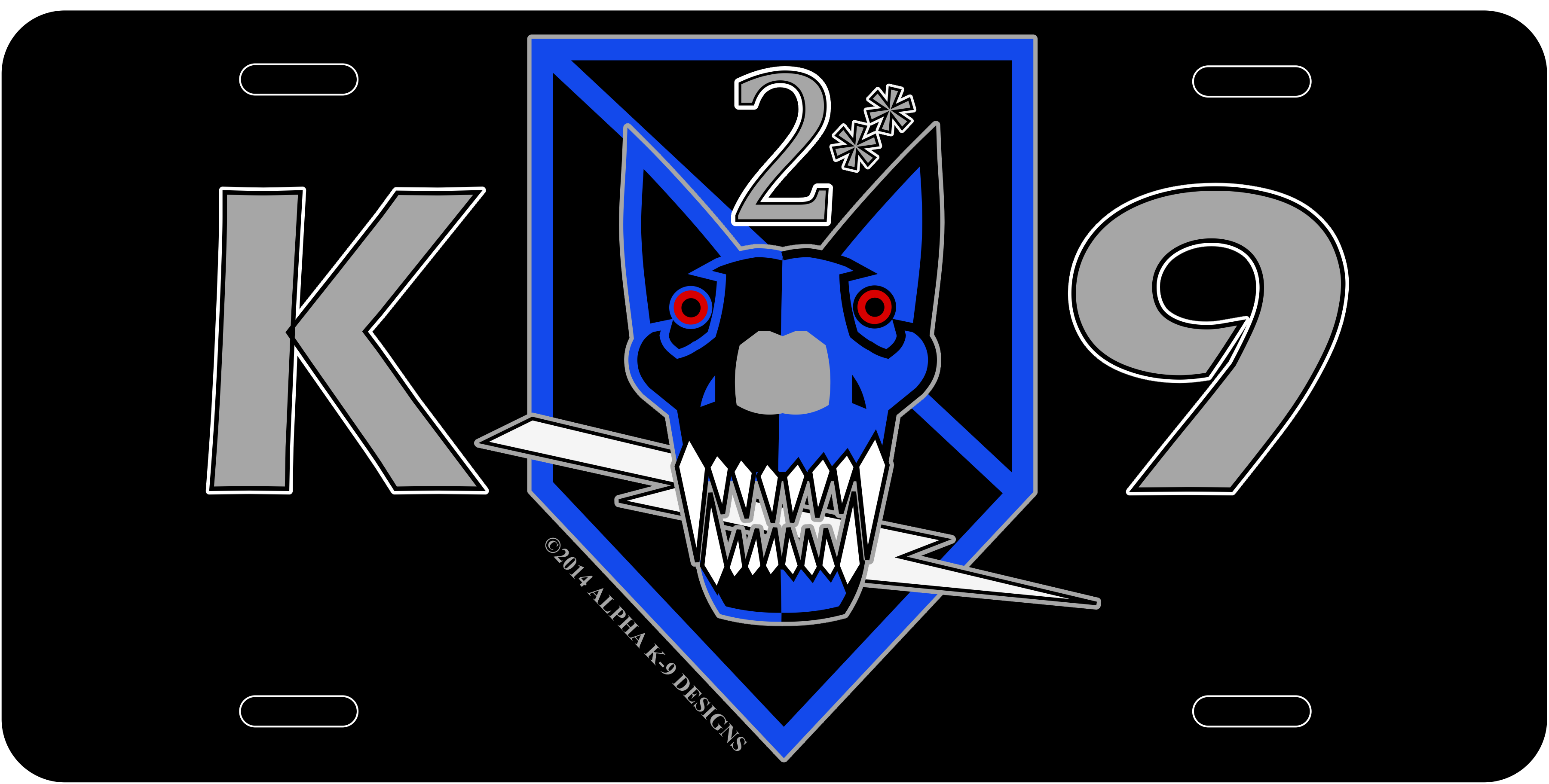 2** K9 Skull design on a 6" x 12" die-sublimated aluminum license plate.