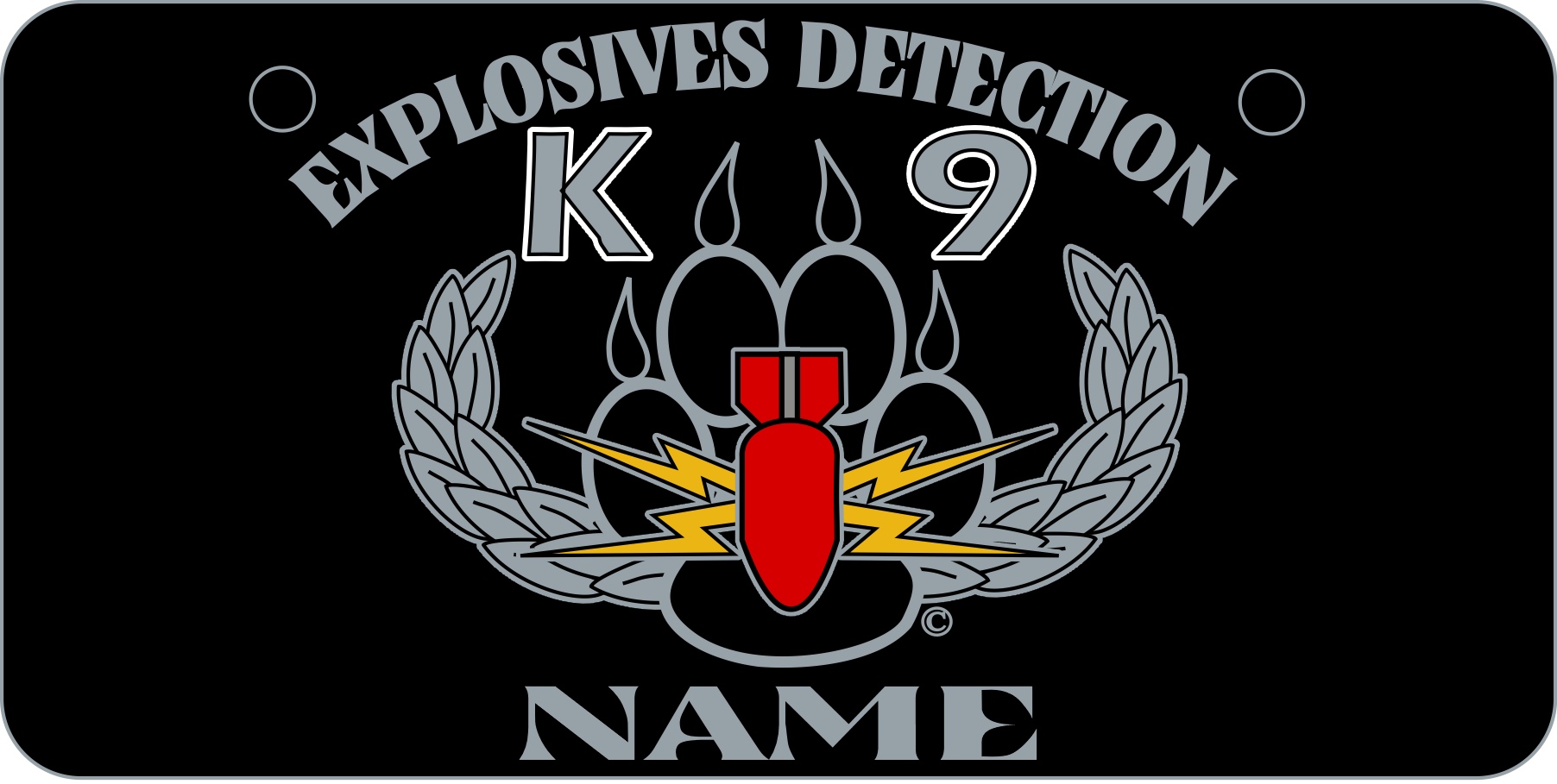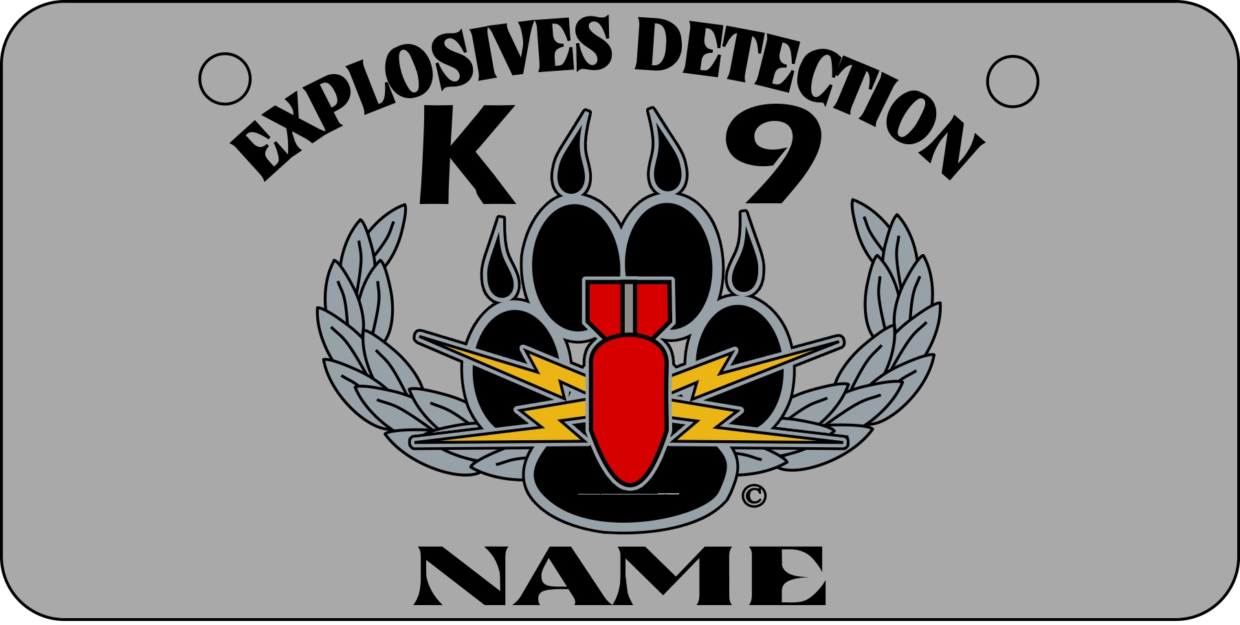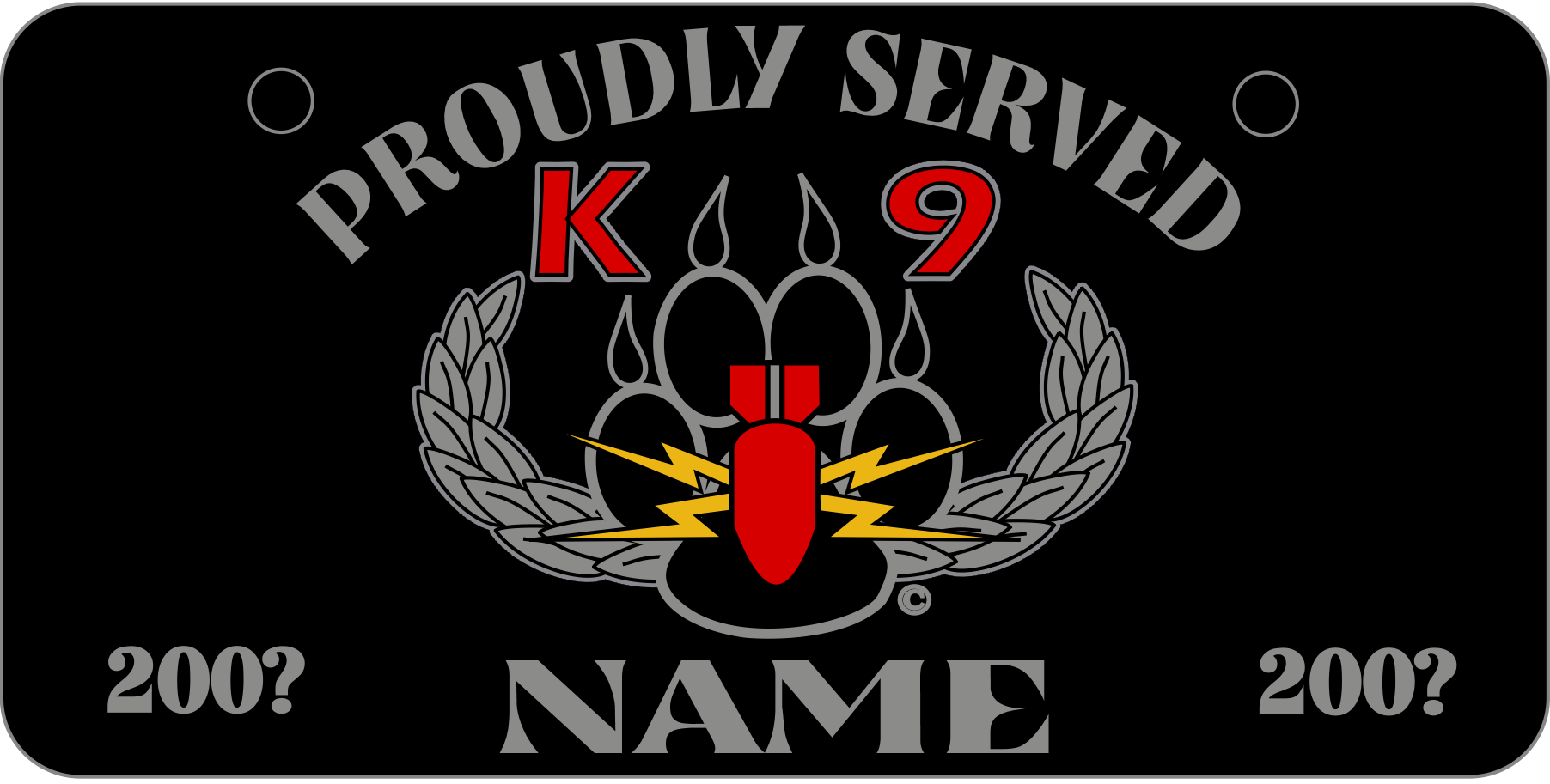 Customize a 6"x 3" aluminum kennel tag with your K-9's name, brand #, service dates, or any info. CHANGE TOP PHRASE & ADD K-9 INFO (text & placement on tag) IN MESSAGE BOX AT CHECKOUT!