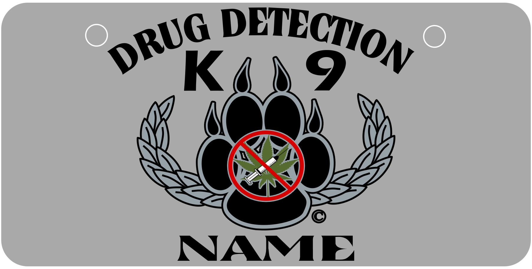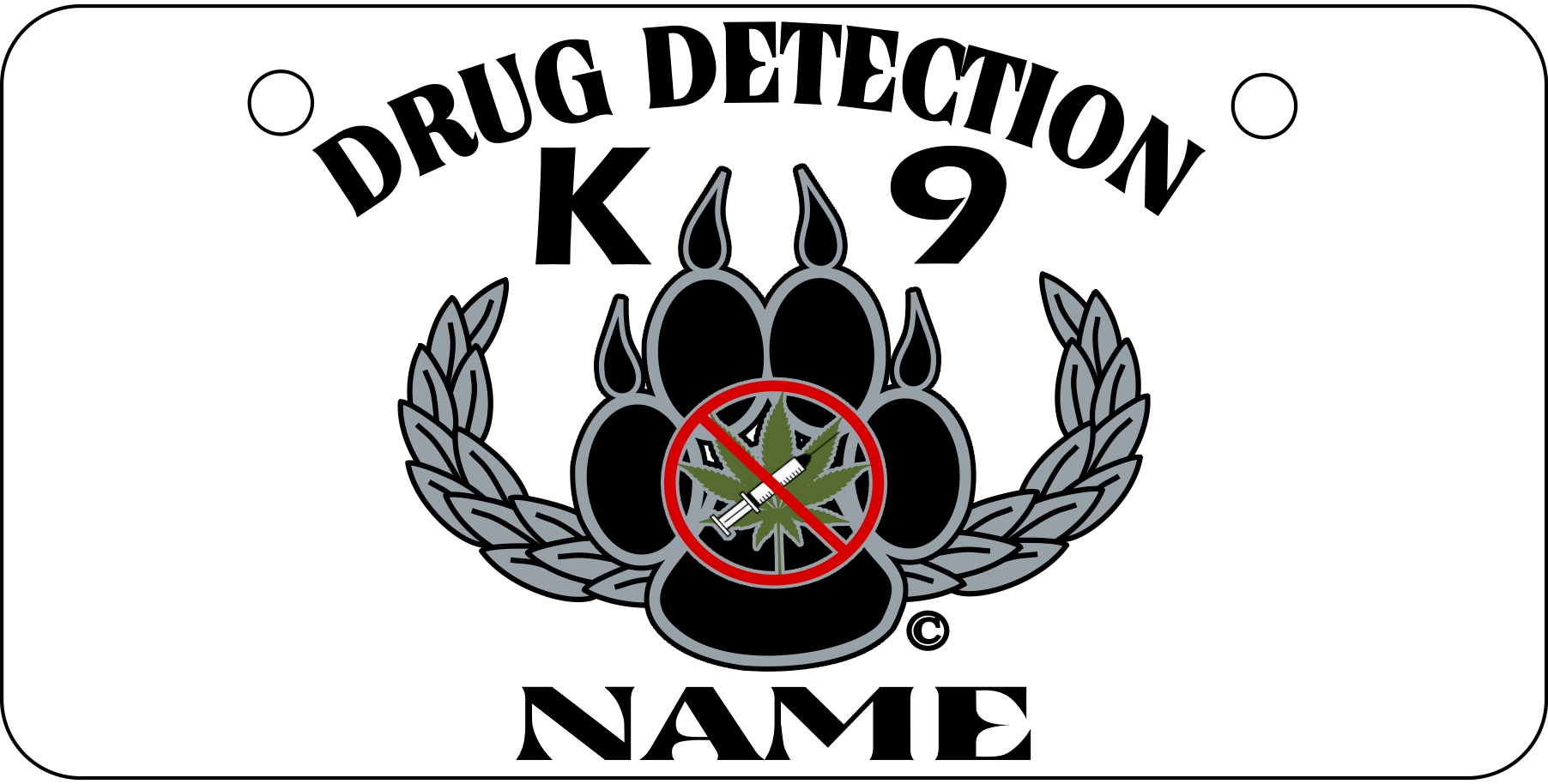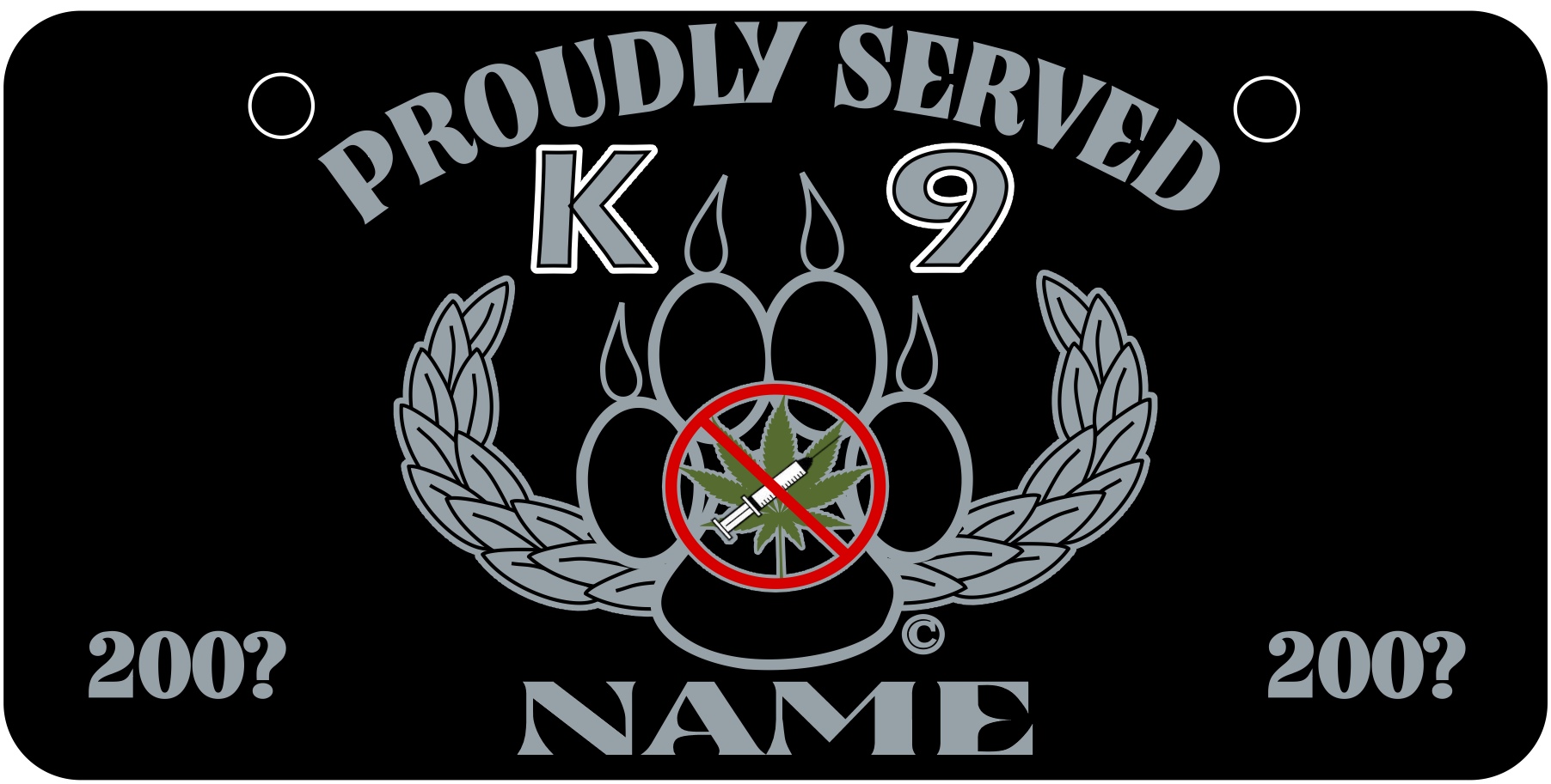 Customize a 6"x 3" aluminum kennel tag with your K-9's name, brand #, service dates, or any info. CHANGE TOP PHRASE & ADD K-9 INFO (text & placement on tag) IN MESSAGE BOX AT CHECKOUT!
